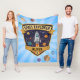 This playful personalized fleece blanket features a bold space explorer badge for future explorers. In the centre of the badge is a playful cartoon rocket soaring through space with planets orbiting around it.
