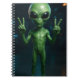 Futurist 3D-style green alien with bright black eyes and detailed skin, gestating peace with both hands. A charismatic and enigmatic presence in a scenario of neon space lights.
