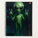 Futurist 3D-style green alien with bright black eyes and detailed skin, gestating peace with both hands. A charismatic and enigmatic presence in a scenario of neon space lights.