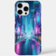 futuristic neon cityscape, streets illuminated with bright blue and purple lights in cyberpunk style, holographic signs, minimalist and stylish design, vertical format