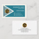 Card features a Cyan colored triangle and polygon design. Over at the top lies your prestigious name and job title alongside a slogan option near the center. Towards the base are the contact details housed by triangle buttons. A gold logo and its business name is attached to the triangle on the left face.