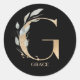 Letter G monogram floral. Letter G in golden brown texture accented with green watercolor compound leaves, flower blossoms and melted gold splashes. Personalized with name in matching font.