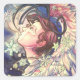 A closeup of the angel Gabriel's face seen in profile, she has short dark hair and is blowing out cold air in dark swirls, with a crescent moon in the background of the blue and black night sky. Her wing, seen up close with ice-like feathers in blues, purples, and hints of aqua and blue-green, glows brightly like snow, curves in front of her. Large snow crystals glowing as though with internal light swirl around in the foreground. Watercolor and Ink Pen. I dreamed I was working on this painting, which was my inspiration.