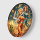 Time travel back to the Atomic Age with this bold and colorful retro clock! Featuring two fierce space heroines in vintage-style spacesuits, cosmic starbursts, rocket ships, and a curious alien sidekick, this design brings mid-century sci-fi charm straight to your wall.