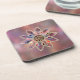 Un design fractal pâle mais coloré comme des nuages d'étoiles dans l'espace ou du marbre multicolore aux tons rose, mauve, pêche et bleu. L'arrière - plan est une texture tachetée comme une nébuleuse lointaine, et la pièce est accentuée par un médaillon de starburst encadré d'or comme si incrusté de figuier d'or. Compléter l'image sont des bijoux lisses à l'opale et des pierres précieuses facettées inset dans un fleuron doré.