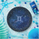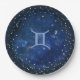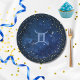 Paper plates featuring an artistic galaxy backdrop and the blue Gemini zodiac symbol . Customize with your choice of number, monogram, or name for a personal touch. This will bring celestial elegance to the birthday of a Gemini .