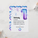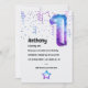 Trendy blue and purple galaxy faux foil number balloon first birthday party invitation with a masculine flair.