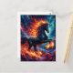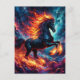 This dynamic postcard features artwork of a fiery black horse rearing up in the celestial realm, representing the "Year of the Horse" Chinese zodiac. For 2026, the animal is a horse and the element is fire. In this vibrant artwork, both are combined in a radiant black, orange, and space blue watercolor artwork with saturated colors.