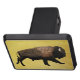 A digital painting of the American bison, or buffalo, superimposed on a brain-tan leather background image. The bison (Bison bison), the largest land mammal in North America, is considered a keystone species: they once roamed the continent in great herds, and their grazing pressure helped shape the ecology of the Great Plains. Two subspecies or ecotypes have been described: the plains bison (Bison bison bison), smaller in size and with a more rounded hump, and the wood bison (Bison bison athabascae) – the larger of the two and having a taller, square hump. The bison is a relative newcomer to North America, having originated in Eurasia and migrated over the Bering Strait About 10,000 years ago it replaced the steppe bison (Bison priscus), a previous immigrant that was much larger. It is thought that the steppe bison became extinct due to a changing ecosystem and hunting pressure following the development of the Clovis point and related technology, and improved hunting skills. During this same period, other megafauna vanished and were replaced to some degree by immigrant Eurasian animals that were better adapted to predatory humans. The extant bison, technically a dwarf form, was one of these animals. There were once an estimated 20-30 million bison, also referred to as buffalo, roaming North America. Their range once roughly comprised a triangle between the Great Bear Lake in Canada's far northwest, south to the Mexican states of Durango and Nuevo León, and east along the western boundary of the Appalachian Mountains. The first thoroughfares of North America, except for the time-obliterated paths of mastodon or musko, were the traces made by bison and deer in seasonal migration and between feeding grounds and salt licks. Many of these routes, hammered by countless hoofs instinctively following watersheds and the crests of ridges in avoidance of lower places' summer muck and winter snowdrifts, were followed by Native Americans and were invaluable to explorers.. The term "buffalo" may be considered a misnomer for this animal, as it is only distantly related to either of the two "true buffalo," the Asian water buffalo and the African buffalo. However, "bison" is a Greek word meaning ox-like animal, while "buffalo" originated with the French fur trappers who called these massive beasts bœufs, meaning ox or bullock – so both names, "bison" and "buffalo," have a similar meaning. In reference to this animal, the term "buffalo," which dates to 1635, has a much longer history than the term "bison," which was first recorded in 1774.The American bison is more closely related to the wisent or European bison. Unregulated shooting of bison, which culminated in mass slaughters during the 1870s, reduced the population to 1,091 in 1889. Today, approximately 500,000 bison live across North America. Most are not pure bison but rather have been cross-bred with cattle in the past and are raised as livestock on ranches. Fewer than 30,000 bison are in conservation herds, and fewer than 5,000 are free-ranging and disease-free. Today bison are ecologically extinct throughout most of their historic range, except for a few national parks and other small wildlife areas. Yellowstone National Park has the largest population of free-roaming plains bison (about 4,000), and Wood Buffalo National Park has the largest population of free-roaming wood bison (about 10,000). A bison has a shaggy, long, dark brown winter coat, and a lighter weight, lighter brown summer coat. The winter coat is so thick and well insulated that snow can cover its backs without melting. Male bison are slightly larger than females. Plains bison typically weigh from 700 to 2,200 lbs. The heaviest wild bull ever recorded weighed 2,800 lbs. When raised in captivity and farmed for meat, the bison can grow unnaturally heavy and the largest semi-domestic bison weighed 3,800 lbs. The heads and forequarters are massive, and both sexes have short, curved horns that can grow up to 2 feet long, which they use in fighting for status within the herd and for defence. Bison are herbivores, grazing on the grasses and sedges of the North American prairies. Their daily schedule involves two-hour periods of grazing, resting and cud chewing, then moving to a new location to graze again. This regular motion ensures that bison seldom overgraze an area. Bison often rub and roll on the ground creating shallow, saucer-like depressions called wallows. Bison roll in wallow, wet or dry, covering themselves with dust or mud. Past explanations and current hypotheses suggested for wallowing behaviour include grooming behaviour associated with shedding, male-male interaction (typically rutting behaviour), social behaviour for group cohesion, play behaviour, relief from skin irritation due to biting insects; reduction of ticks and lice; and thermoregulation. Wallows were once a common feature of the plains. In winter, bison can dig through deep snow with their heads to reach the vegetation below. Bison have poor eyesight, but have acute hearing and an excellent sense of smell. Bison can reach speeds of up to 35 mph. Bison have a life expectancy of approximately 15 years in the wild and up to 25 years in captivity. Bison mate in late spring and summer in more open plain areas. During fall and winter, bison tend to gather in more wooded areas. During this time, bison partake in horning behaviours. They will rub their horns against trees, young saplings and even telephone poles. Aromatic trees like cedars and pine seem to be preferred. Horning appears to be associated with insect defence as it occurs most often in the fall when the insect population is at its highest. Cedar and pines emit an aroma after bison horn them and this seems to be used as a deterrent for insects. While often secure from predation due to their size and strength, in some areas, bison are regularly predated by wolves. Wolf predation typically peaks in late spring and early summer, with attacks usually bei