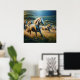 A vibrant painting capturing the essence of a herd of horses running through a lush green field, their powerful muscles in motion as they kick up dust and grass in their wake.