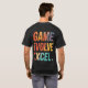 The t-shirt design features the phrase "Game, Evolve, Excel." in a bold, multi-coloured font. The text is set against a blurred background, creating a dynamic and eye-catching effect. The design is perfect for anyone who embraces a competitive spirit and strives for continuous improvement.