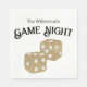 These custom party napkins feature a Game Night theme. An image of playing dice are printed in the centre in a gold glitter design. The phrase "Game Night" is printed above the dice with a sample family name. You can personalize the napkins to include your own custom name or text.