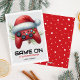 Gaming kids classroom christmas cards featuring a simple white & gray background, a red games controller wearing a santa hat, with the pun greeting "game on it's christmas", and the childs name at the bottom.