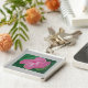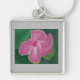Silver coloured keychain with image of a pink flower drawn in coloured pencil.