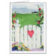 A blank note card with a heart on the garden gate.
