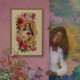 Saint Rose of Lima is surrounded by an arrangement of beautiful, colourful flowers and ornate scroll work. A background of yellow brocade compliments the elaborate illustration collage.