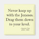 L'écrivain anglais, avec et raconteur Quentin Crisp (1908 - 1999) déplorait le concept de rester en phase avec les voisins et la consommation, l'avidité et l'envie qu'il implique. Sa citation pleine d'esprit sur le sujet de voisins comme les Joneses attirera beaucoup de gens : "Ne jamais suivre les Joneses. Faites-les descendre à votre niveau." L'aimant ferait un cadeau amusant pour les amis et la famille qui déménagent dans une nouvelle maison. Vous pouvez modifier la couleur de l'arrière - plan sur l'aimant du réfrigérateur pour l'adapter.