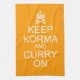 Cette serviette de thé d'amusement comporte une parodie des affiches anglaises célèbres de temps de guerre, l'inspiration "gardent le calme et continuent", cette cuisine et la parodie, "maintiennent Korma et cari sur", avec la couronne et le couteau et la fourchette dans le blanc. La couleur d'arrière - plan est personnalisable.