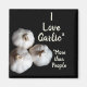 A humourous culinary kitchen magnet with 3 white Garlic bulbs tastefully arranged and highlighted against a black background and a fun warning that "I Love Garlic more than People". The text may be personalized. This magnet makes a fun gift for a gourmet chef, Your favourite cook or Italian cuisine lover. This is original food photography by JLW_PHOTOGRAPHY.