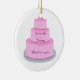 La peinture d'un gâteau rose à trois niveaux décoré de coeurs rose pâle et de garnitures rose foncé, sur un plateau d'argent, avec des espaces réservés pour votre texte, est imprimée sur des ornements personnalisés. Le texte est facile à customiser et à coordonner avec le gâteau. Merci pour votre parrainage de CherylsArt sur Zazzle.