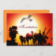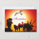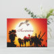 Seagull flying over the people & palm trees, art in a yellow orange colour. you can customize this invitation.