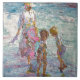A mother, sunhat gently tilted, guides two children through a shimmering tidepool of color and light. They bend in curiosity, searching for sea‑treasures beneath the ripples — shells, stones, maybe memories. The scene captures the innocence of childhood and the quiet strength of maternal presence.