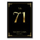 Cartes de numéro de table du mariage Great Gatsby Art Déco avec le numéro d'or 71 et le texte modifiable, où vous pouvez ajouter vos noms et la date du mariage, imprimé sur arrière - plan noir