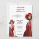 Two beautiful woman are wearing sleeveless red flapper girl fringed dresses and pearls. The caucasian woman has an elegant red hat on her head and the melanin woman a chic headband adorned with soft red feathers. Both woman have sleek, short bobs and are set against a white background that has templates on it for your custom wording. Two faux silver ornate art deco style frames completes this luxurious design which is suited to a roaring twenties; 1920's; great gatsby; vintage art deco themed event or celebration. They are perfect for both business and personal use. The back is plain black