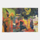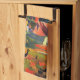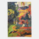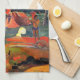 Gauguin Landscape with Peacocks kitchen towel. Oil painting on canvas from 1892. Paul Gauguin is most recognized for his famous paintings of Tahiti. Matamoe, Or Landscape with Peacocks is one of his most beloved works. Peacocks walk in the foreground as a Tahitian man chops wood by a fire. A hut stands in the background with two women talking below palm trees as the sunset turns the landscape orange, purple, red and yellow. A great gift for fans of Paul Gauguin, peacocks, Tahiti, post-impressionism, and tropical art.