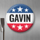 A fun design featuring Gavin's name in the style of the I Like Ike button from history. A classic design for the Governor of California - Gavin Newsom. A patriotic stars and stripes design for Newsom running for President in the election.
