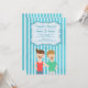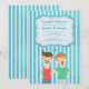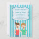 A cute gay couple wedding shower invitation featuring two guys, arm in arm with a blue grunge background and a white stripe overlay. The card is easy to customize with your wording, font, font colour, paper shape options and choice of six paper types.