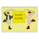 Two cartoon men wearing white underpants, hats and boots. They are holding a sign between them that says 'Happy Easter'. The card has a yellow background.