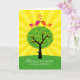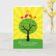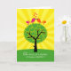 Two birds, sitting on a tree, K-I-S-S-I-N-G! Colourful stylized birds on top of a tree with heart leaves and yellow sun rays radiating out. A bright and cheerful congratulations card for an anniversary.