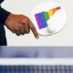 This artwork features the state of Idaho formed from a colorful rainbow.