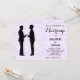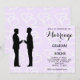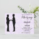 This gay wedding invitation features two cool grooms in black silhouettes paired with elegant script on a background of pale lilac hearts.