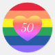 Gay Pride rainbow birthday sticker, with a colourful 50 and Fabulous and colourful heart design. With white and black script typography lettering, you can customize with your own text. A fun addition for that special 50th Birthday celebration.