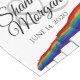 This table runner is designed to coordinate with our Gay Pride Rainbow Wedding Suite. It features the name of the couple & wedding date as well as a row of gay pride rainbow flags. Great addition to your wedding reception décor.