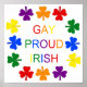 This poster features a graphic image of a selection of rainbow coloured shamrocks encircling a rainbow coloured message that says "Gay Proud Irish". The design is for all LGBT Irish people who love their Irish roots and are proud to be Gay.