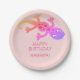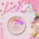 Gecko birthday paper plates for kids. The plates have a cute gecko. Rainbow gecko is especially great for girls. The background is pink. Personalizable paper plates with a Happy Birthday text and a child`s name. Easily personalize the plates. The text is in pink colour. Great for a boy or girl birthday party.