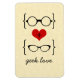 Cute and whimsical Geeky Glasses Premium Flexi Magnet featuring a red heart flanked by two pairs of geeky eyeglasses, a manly pair and a girly pair. This sweet magnet will add nerdy flair any place you stick it! Easy to customize, simply add the personalized text of your choosing. Click "Customize It" to find more personalization options.