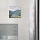 Square souvenir photo magnet of the famous fjord Geirangerfjord, a cruise ship and the village of Geiranger between the mountains in Norway.