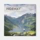 Photo souvenir carré aimant du célèbre fjord Geirangerfjord, un paquebot de croisière et le village de Geiranger entre les montagnes en Norvège avec le texte : 'NORWAY, Geirangerfjord'.