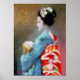 Impressionist painting of Japanese geisha in training (maiko.) She is wearing a blue kimono with a red sash.