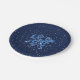 Paper plate featuring the symbol for Gemini in soft silver blue, overlaid with the stars of the constellation, against a starry sky background in deep midnight blue
