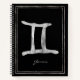 Stylized hammered silver Gemini the Twins astrology zodiac birthday symbol in a hand drawn silver fine double line frame. T A hardcover or softcover notebook with your choice of inside pages. Choose from sketchbook, bullet journal, checklist, graph paper, recipe book, or lines in various widths and colours. Customizable. Aquarius text in a fine script on the front cover can be personalized, text can also be added on the back.