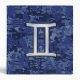 A silver chrome like Gemini zodiac symbol applique on a vibrant navy blue digital camouflage design texture print background. A modern urban racy design for a great custom birthday gift idea.