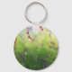 A silvery spider web covered with sparkling dew drops glitters in the warm sunlight of a fresh green spring morning. The tiny pink blossoms of a tree hang behind the web, reflected in the droplets.