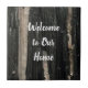 This decorative tile offers a unique way to welcome guests to your home. This tile features a photo of a black and white striped gemstone. This gem displays white crystals and black stone that come together to form the stripe pattern. "Welcome to our home" appears in white font in the centre of this tile and can easily be customized if you desire.