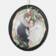 Elegant photo Christmas ornament features a favorite photo encircled by a faux gold foil geometric frame with green watercolor foliage and red berries. Add your names and the year, or a custom message, to the reverse side in a matching frame.