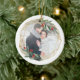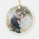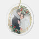 Elegant photo Christmas ornament features a favourite photo encircled by a faux gold foil geometric frame with green watercolor foliage and red berries. Add your names and the year, or a custom message, to the reverse side in a matching frame.
